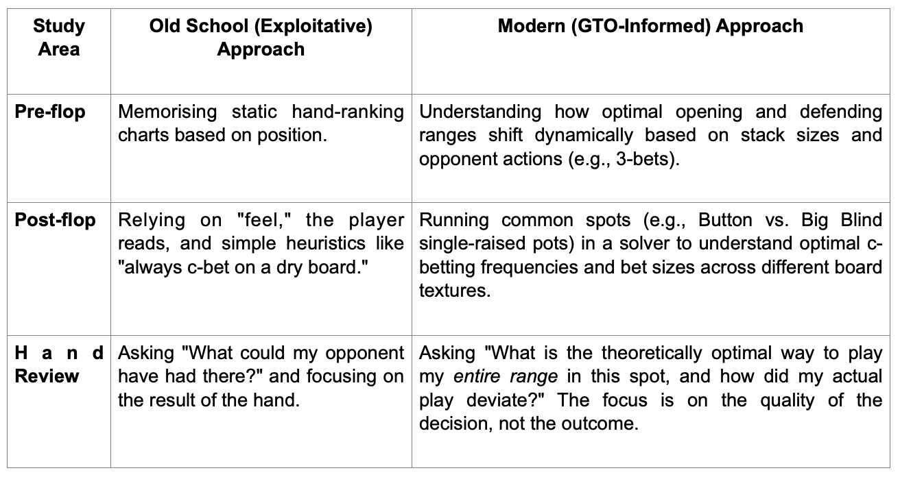 The table below contrasts the traditional study approach with a modern, GTO-informed methodology