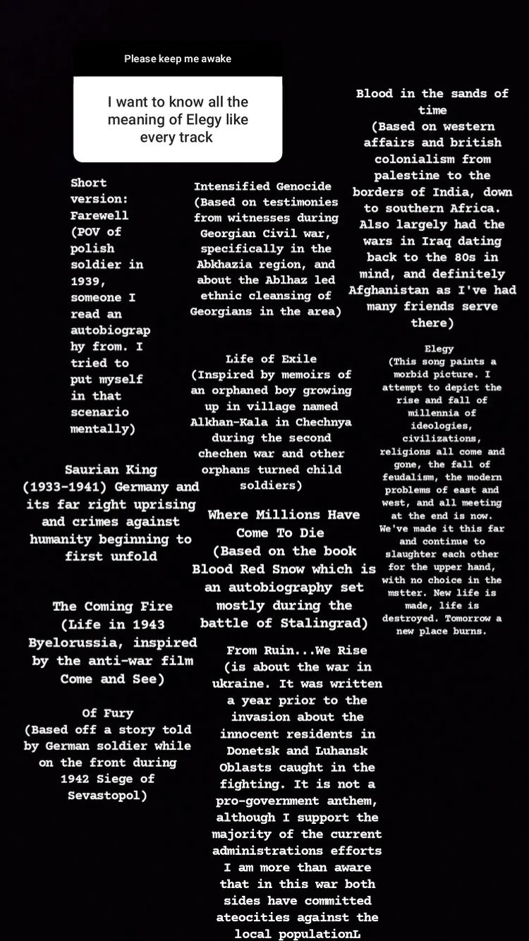 In a recent q/a via his Instagram Story, a fan asked vocalist Ben Duerr about the meaning of every track from Elegy. His answers can be found below!