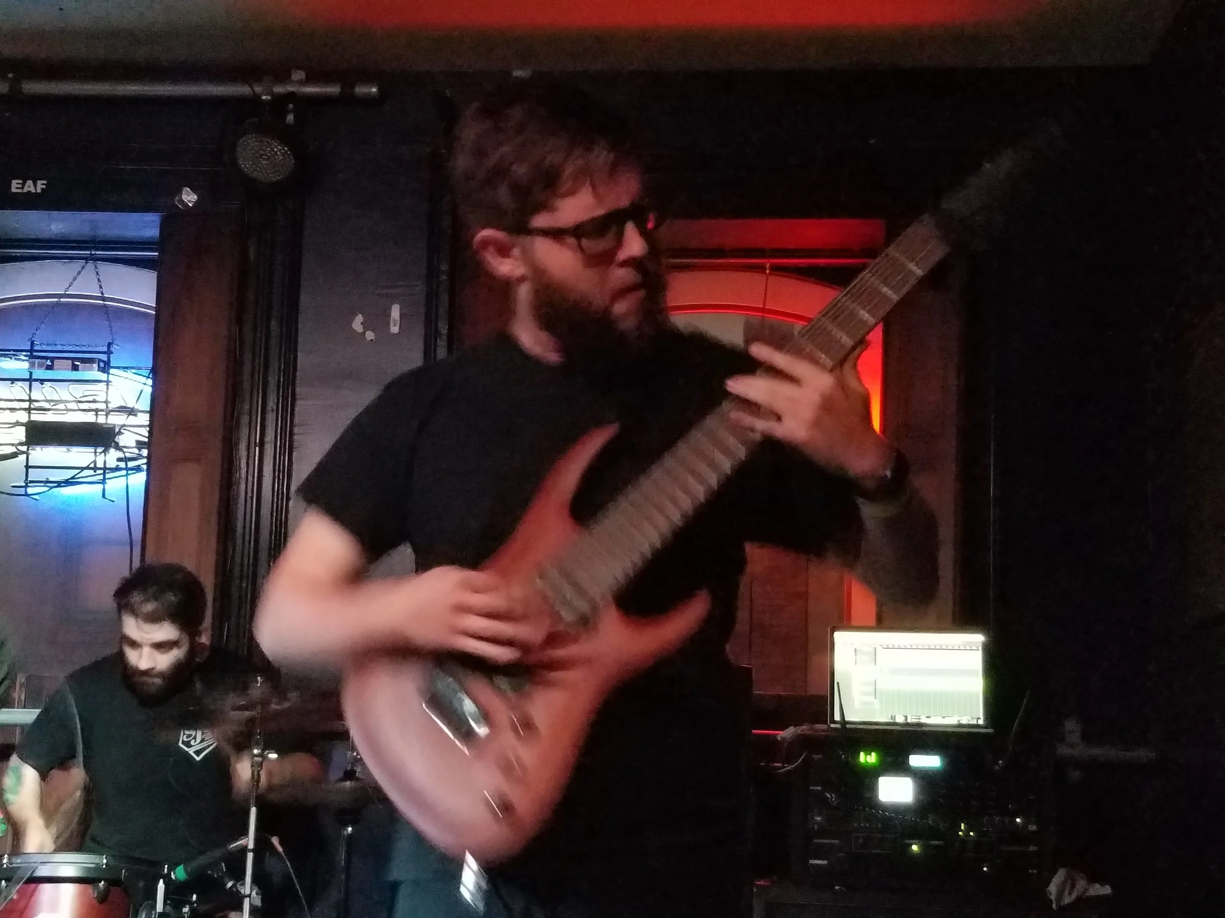 Noah: JT and I are using Line 6 gear. We are team Line 6; Bass Pod and Pod HT Pro, Rocktron Velocity 300 to run my cabs. JT is using a Crown power amp for his bass rig. Then I play what I call ‘Basic Bitch’ Agile 8 string guitars on stage. Everything on them is stock. People are always asking, “man what pickups do you have in that?” You don’t want to know. “Oh… come on what are they Bareknuckles?” Nope, these are the B stock specials. (everyone is laughing at this point)