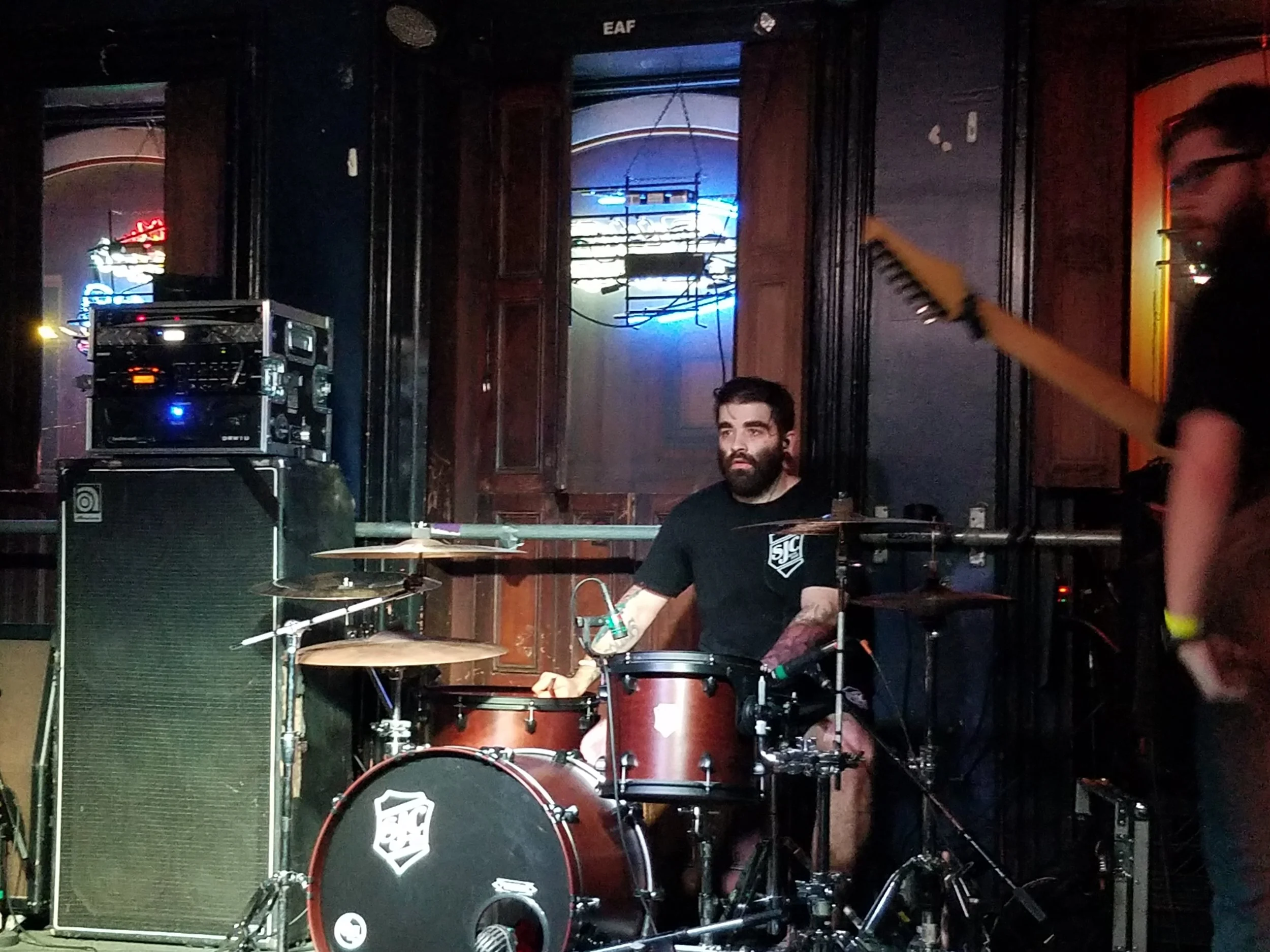Kevin: I am using SJC custom drums, I have been with them for a few months now. I also have TRX cymbals and 64 Audio in-ear monitors. I also use Braddum drumming shoes.