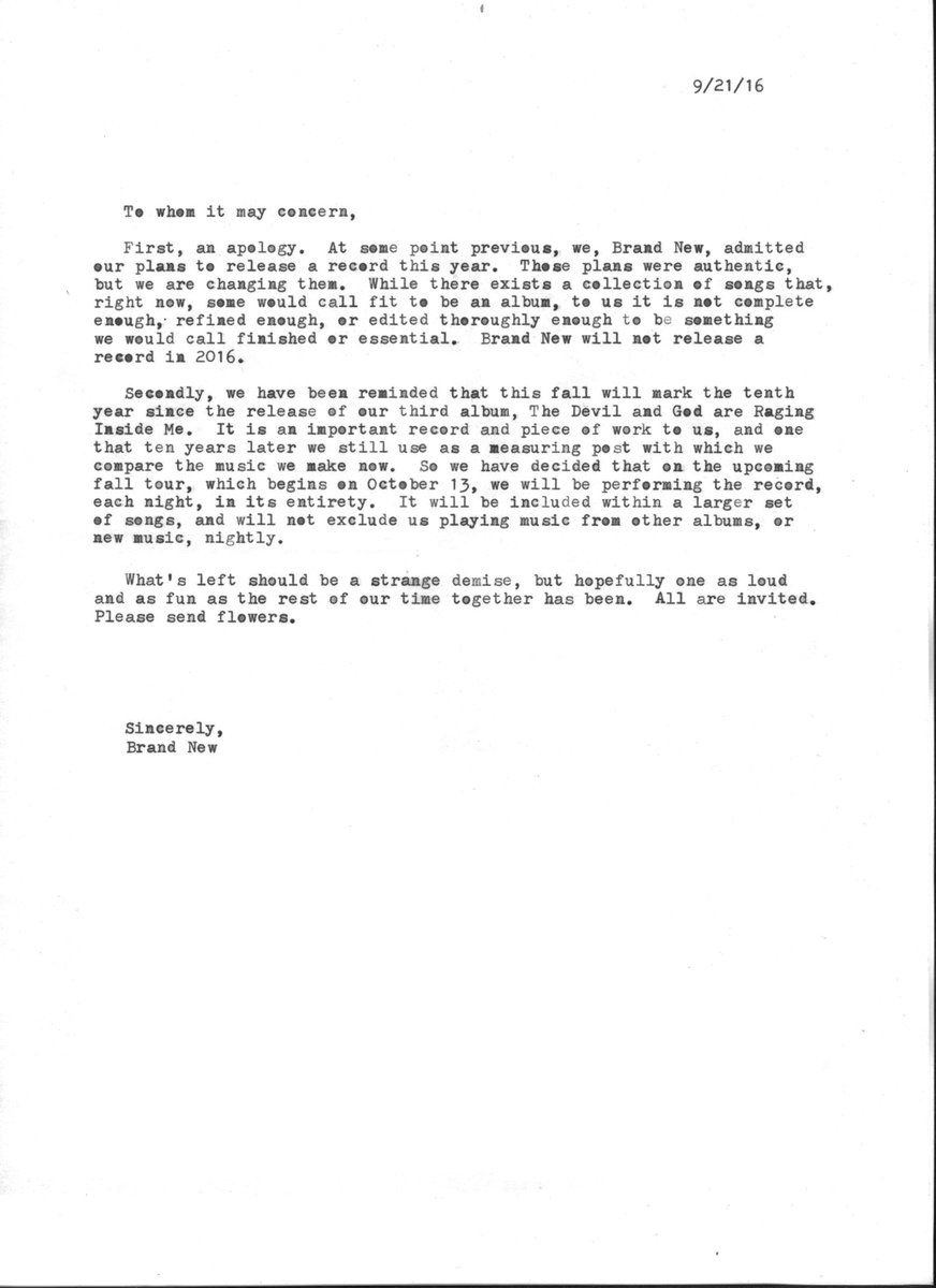 “At some point previous, we, Brand New, admitted our plans to release a record this year. These plans were authentic, but we are changing them… Brand New will not release a record in 2016”