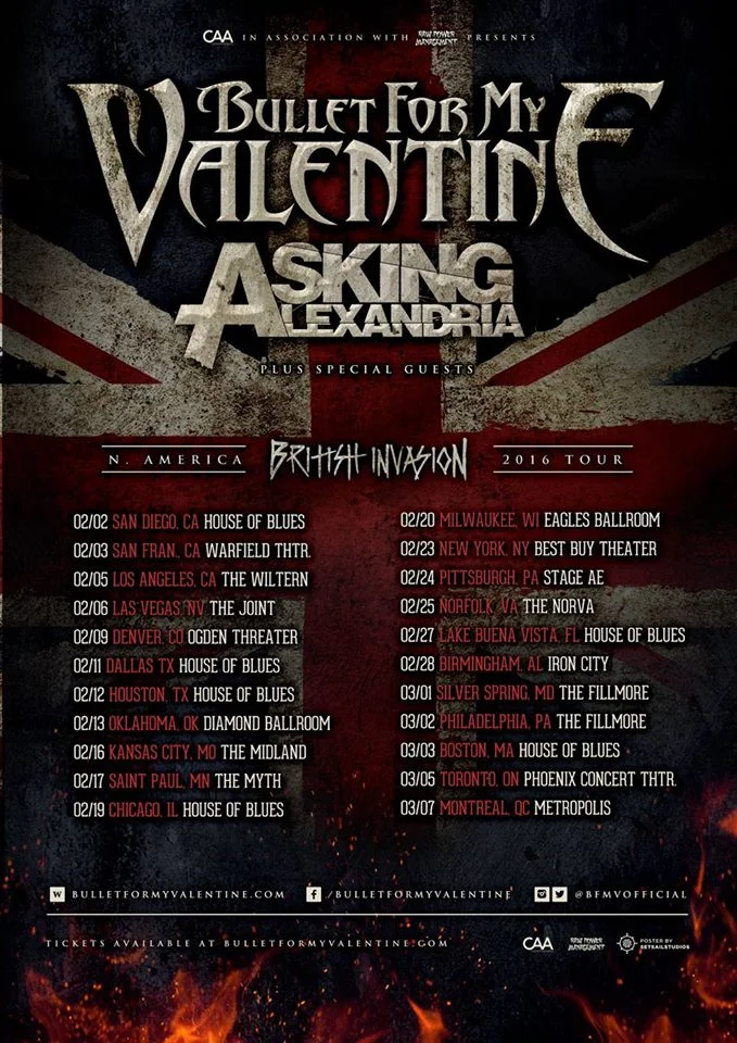 Bullet For My Valentine will return to North America in 2016 for “The British Invasion Tour” in support of their newly released album, VENOM. The tour will feature UK band Asking Alexandria. Tickets will go on sale September 25th to the general public.