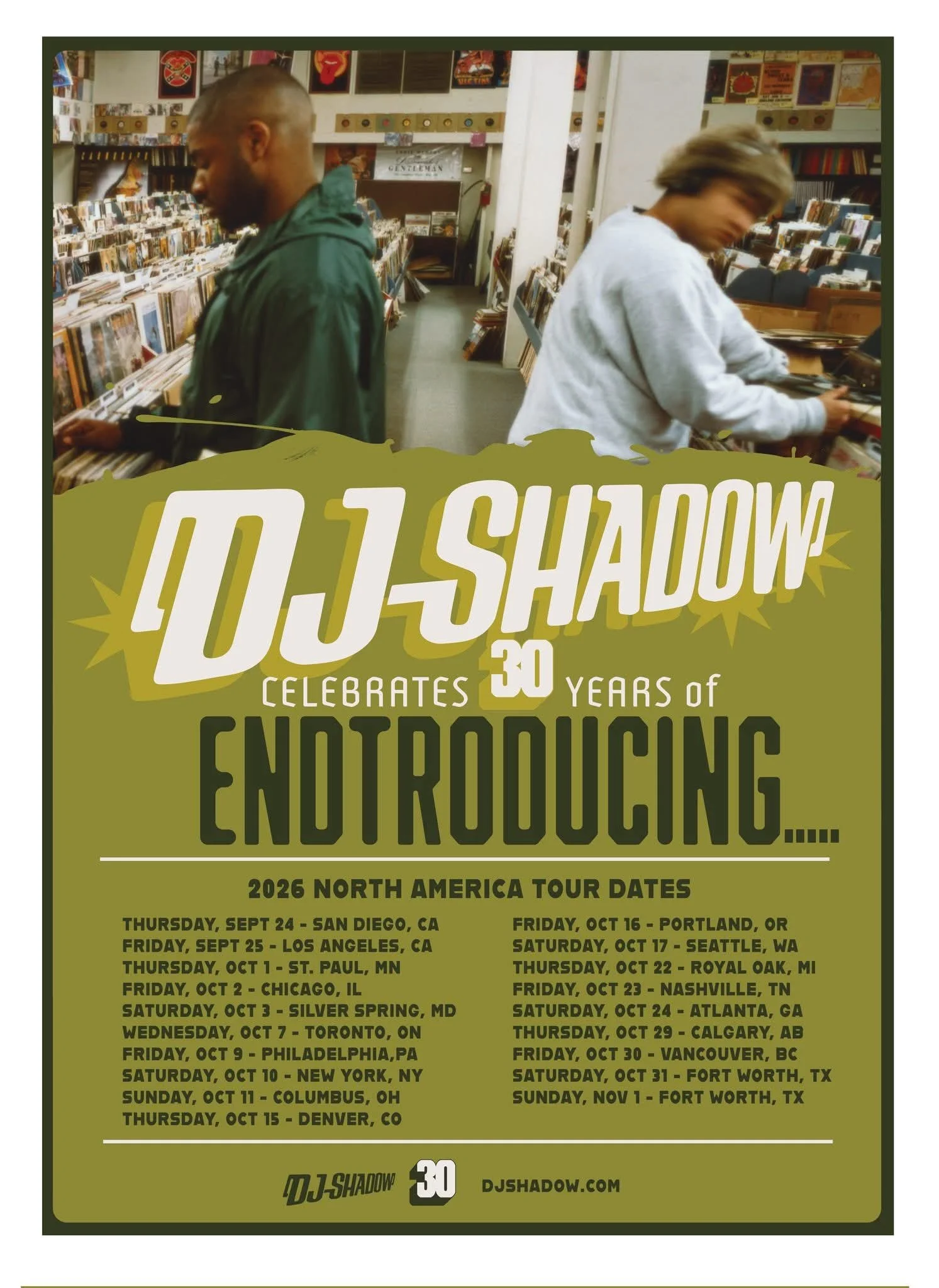 DJ Shadow will be celebrating the 30th anniversary of “Endtroducing…” on a North American tour. Here’s the dates: