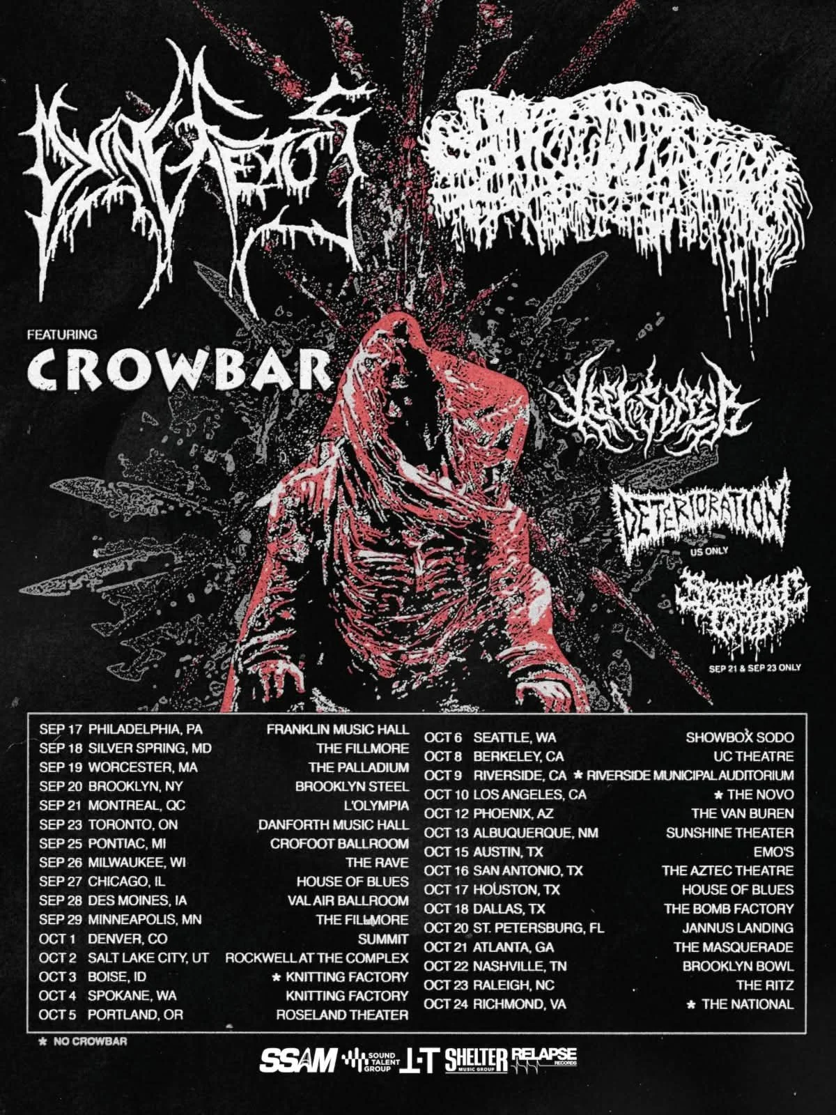 Dying Fetus and Sanguisugabogg have announced a co-headlining tour. Crowbar, Left To Suffer, Deterioration (U.S. only), and Scorching Tomb (Canada only) will open. Here's the dates: