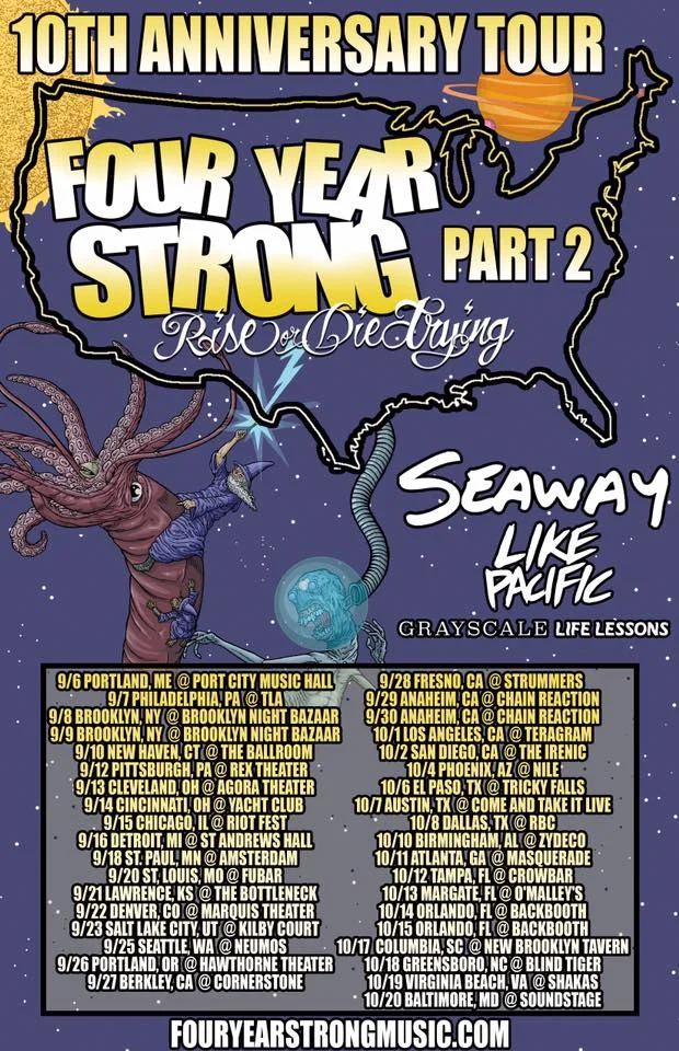 Announced earlier today, Four Year Strong will be hitting the road later this year on the second leg of their “Rise or Die Trying” anniversary tour. Getting support from bands such as Grayscale,Life Lessons, Like Pacific, and Seaway, the band will be on tour from September 6th until October 20th. General admission tickets will go on sale June 16th.What date will you be attending?