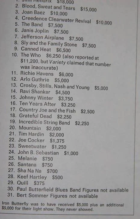 Ultimate Guitar found an impressive chart with payments for every act that played Woodstock "with the exception of Bert Sommer and the Paul Butterfield Blues Band" View the chart below along with Jimi Hendrix's performance.