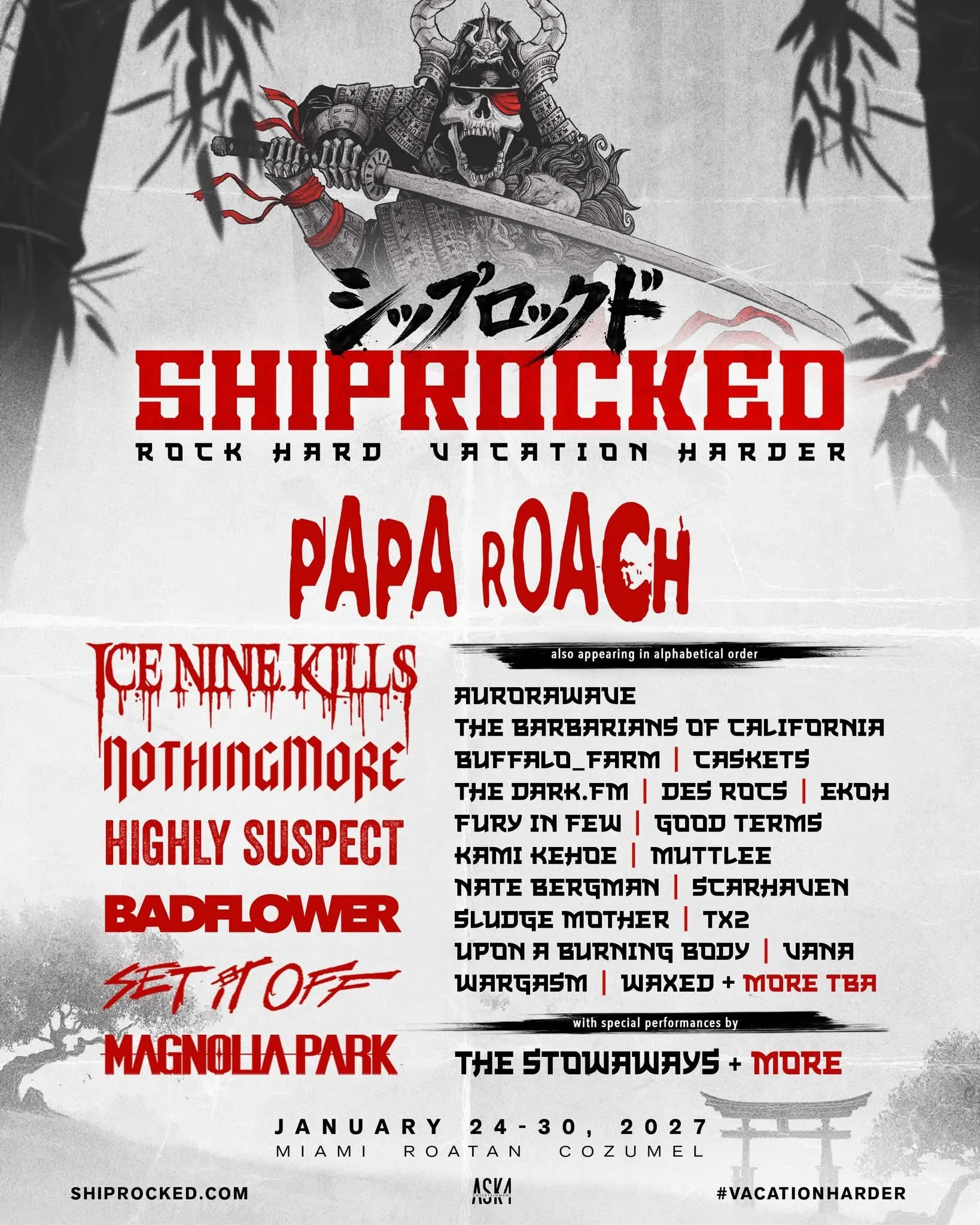 The details have been unveiled for the 2027 ShipRocked cruise. The boat will sail from Miami, Florida to Roatan, Honduras and Cozumel, Mexico on January 24-30 and it will feature: Papa Roach, Ice Nine Kills, Nothing More, Highly Suspect, Badflower, Set It Off, Magnolia Park, Aurorawave, The Barbarians Of California, buffalo_farm, Caskets, The Dark.FM, Des Rocs, Ekoh, Fury In Few, Good Terms, Kami Kehoe, MUTTLEE, Nate Bergman, Scarhaven, Sludge Mother, TX2, Upon A Burning Body, Vana, Wargasm, Waxed, and The Stowaways all-star band.