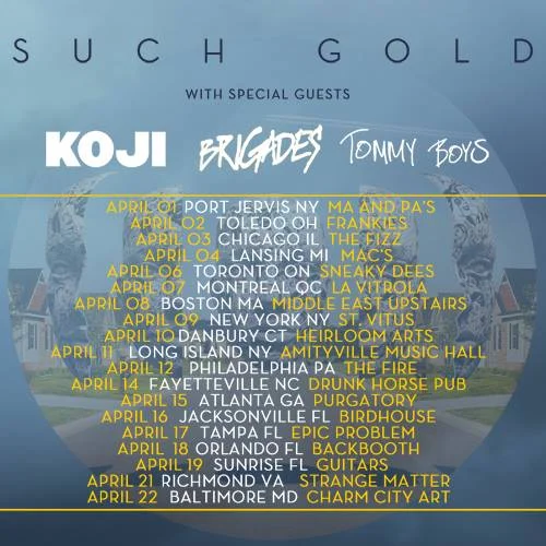 Such Gold Announce Tour With Koji, Brigades And Tommy Boys See a Facebook contest being held by the band here. Winners receive a bundle of merch! Newer:Chunk! No, Captain Chunk! Announce New AlbumOlder:Inside My Home I Wait And Bleed PostedMarch 11, 2015 AuthorAshley Setzer Tagstour, tour dates, such gold