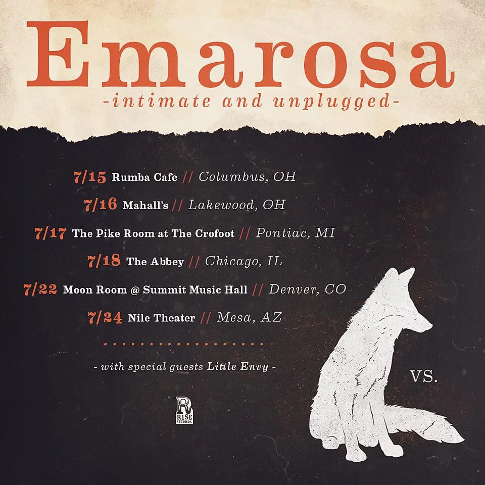 Lexington, KY based rock band, Emarosa (Rise), has announced that following their stint on the Vans Warped Tour (June 19-July 12) they will be hitting the road for a 5 date tour across the Mid and Southwest. Far removed from the the Main Stages of Warped Tour and chaotic circle pits, fans can expect a much more subdued acoustic show featuring songs from Versus. Versus is the band's third album and first with lead vocalist , Bradley Walden.  Emarosa will be joined on tour by Little Envy.