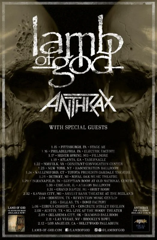 Lamb of God are pleased to announce their upcoming January/February 2016 U.S. headline tour featuring direct support from very special guests and thrash metal legends Anthrax, with additional support from Deafheaven and Kylesa. The tour will begin on Friday, January 15th in Pittsburgh, PA and visit several major U.S. markets before coming to a close in Los Angeles, CA on February 12th. Tour dates are below