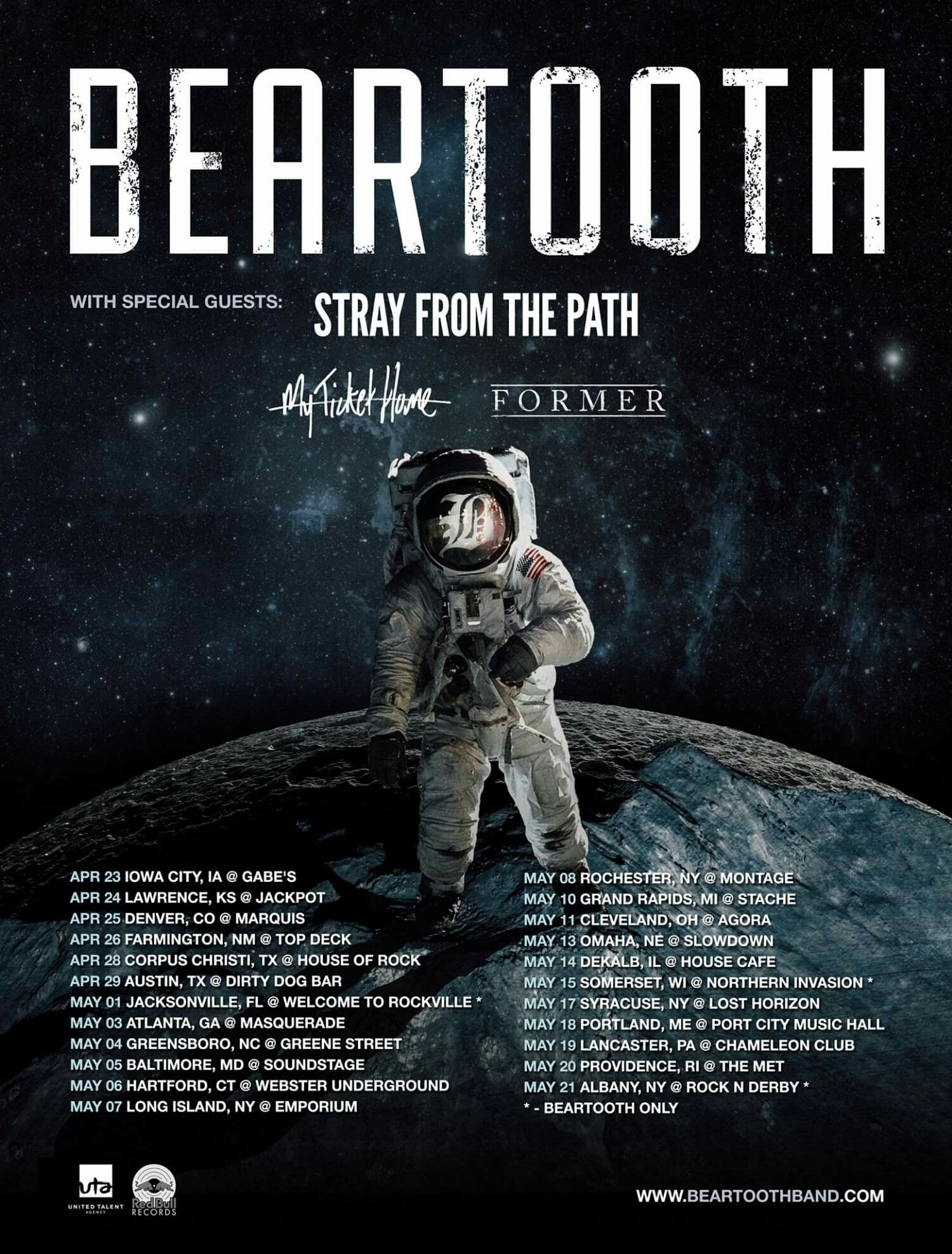 Beartooth is going back on the road starting at the end of April to the end of May. Support for these dates (aside from the festival dates) will be Stray From The Path, My Ticket Home and Former. Tickets to all dates are already on sale so head on over to http://beartoothtickets.com/ and get your tickets now! Additionally, keep an eye on them, because word is they're looking to release their new album this summer. Most likely, they will debut at least one song on this tour.