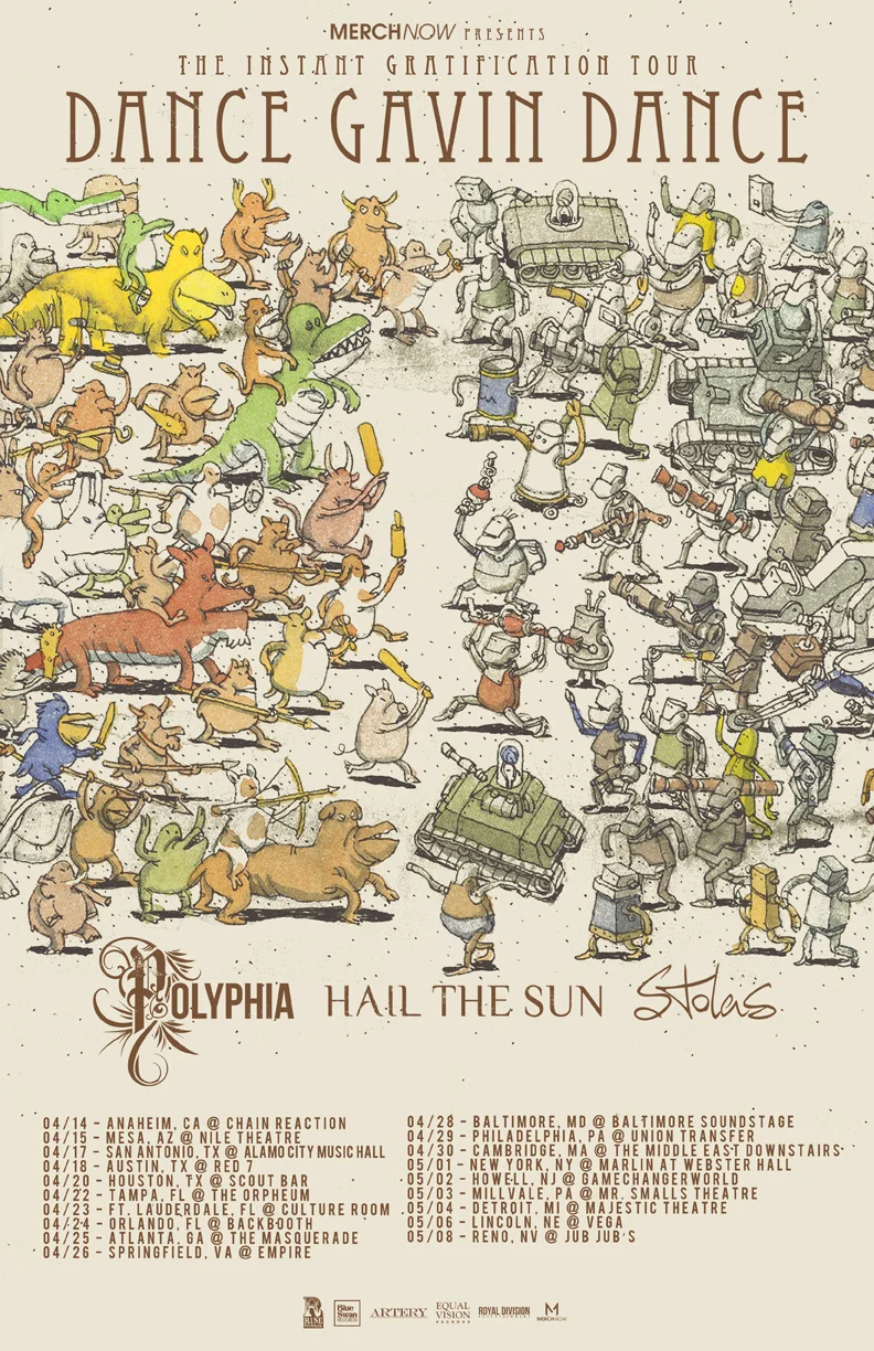 Dance Gavin Dance have announced dates for their upcoming Instant Gratification headline tour. Support comes from Polyphia, Hail The Sun, and Stolas. Tickets will go on sale starting Wednesday at noon local time here.