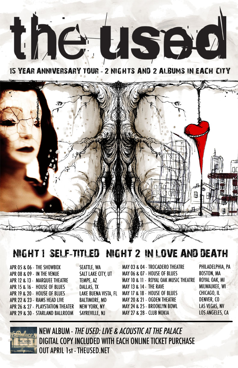 In celebration of their fifteen-year anniversary, The Used will be hitting the road for a North American tour in spring of 2016! The band will be playing two shows per city, performing Self-Titled and In Love and Death in their entirety, plus more each evening. The tour will kick off on April 5th in Seattle, WA and wrap on May 28th in Los Angeles, CA. With each online ticket purchase, fans will get a digital copy of the band's upcoming DVD release, The Used: Live & Acoustic at The Palace. Tickets will be available this Friday, November 20th at www.TheUsed.net.