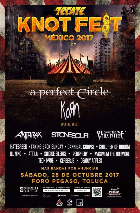 A Perfect Circle, Korn, Anthrax, Stone Sour, Bullet For My Valentine, Hatebreed, Taking Back Sunday, Cannibal Corpse, Children Of Bodom, Ill Niño, Attila, Suicide Silence, Periphery, Maximum The Hormone, Tech N9ne, Cerebrus, and Deadly Apples have all been confirmed for Knotfest Mexico. That event will be held at The Foro Pegaso in Toluca, Mexico on October 28.