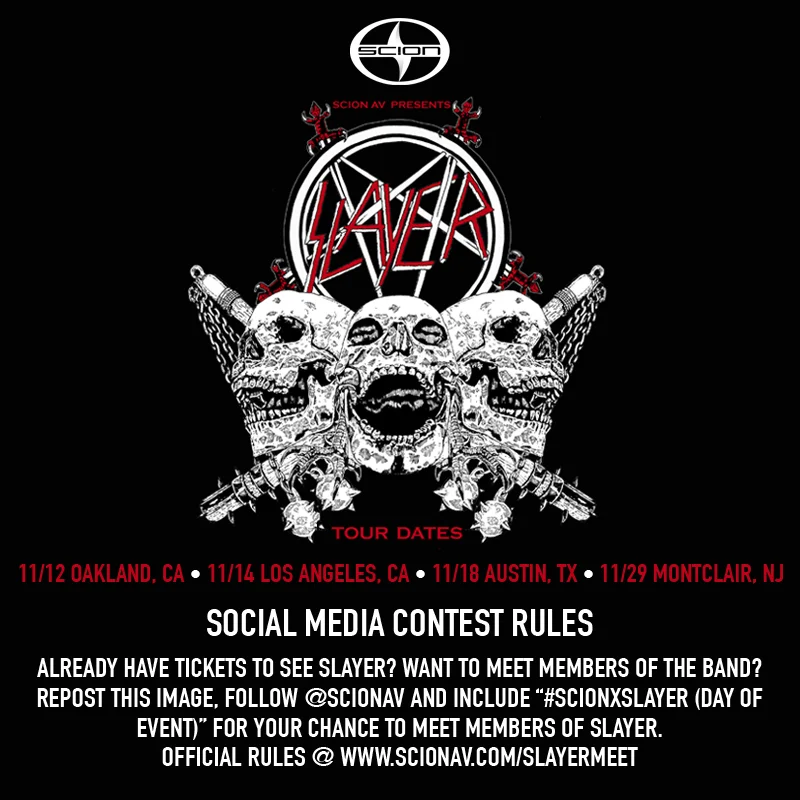 Scion is giving you a chance to win a meet and greet with Slayer in Oakland (Nov. 12 only), Los Angeles, Austin and Montclair, N.J.