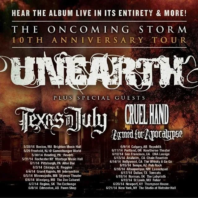 Unearth will be playing The Oncoming Storm front to back on their upcoming 10th Anniversary Tour with Texas In July, Cruel Hand, and Armed for Apocalypse. View the dates below