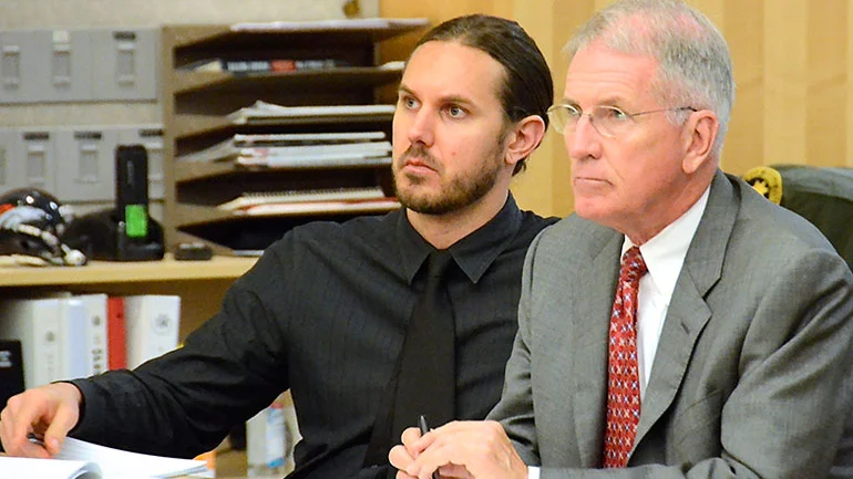 The verdict was handed down as the singer’s ex-bandmates Nick Hipa, Phil Sgrosso and Josh Gilbert looked on. Spilling into the section typically reserved for the defense, many of Meggan’s more than three dozen supporters adorned small yellow felt hearts pinned to their shirts to make their sentiments known. With more than 80 spectators packing the gallery, defense attorney Tom Warwick told the judge that he had a lot of people who support Tim and he wanted “some kind of parity” with the seating in the room.